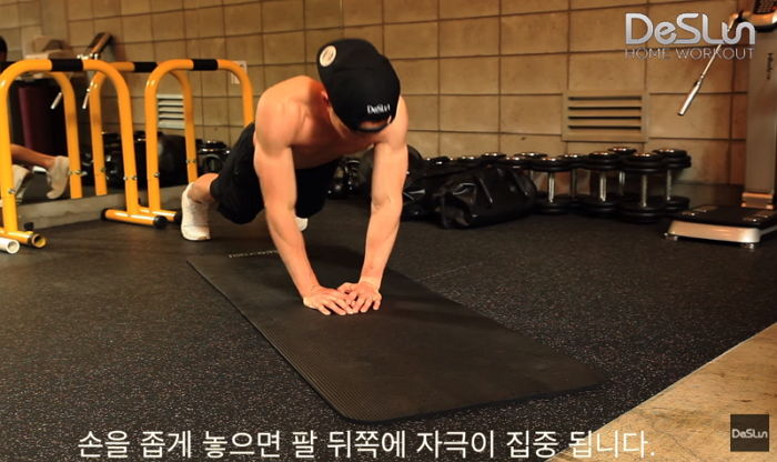네 번째는 삼두 근육을 집중적으로 강화하는 팔굽혀펴기 동작이다. 바닥에 양손을 좁게 붙여놓고 팔굽혀펴기를 한다.