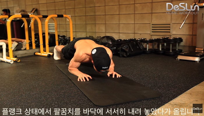 다섯번째 동작은 팔꿈치를 땅바닥에 닿게 하는 팔굽혀펴기다. 팔굽혀펴기를 하면서 팔꿈치를 바닥에 서서히 내려놓았다가 올린다.