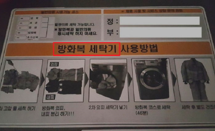 그가 공개한 사진에는 ‘방화복 세탁기 사용방법’이라는 제목으로 방화복 세탁 방법이 상세하게 설명돼 있다.