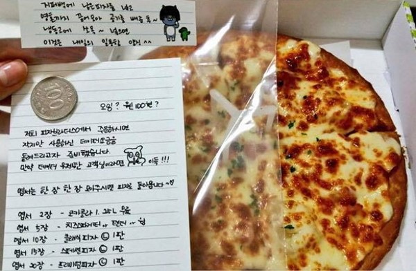 또한 사진 속 쪽지는 ‘쿠폰’처럼 사용할 수 있는 엽서로 “한 장 한 장 모으면 피자로 돌아온다”고 적혀있다.