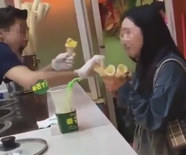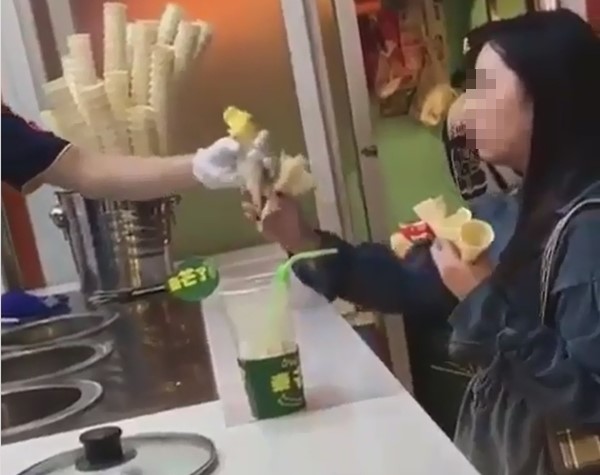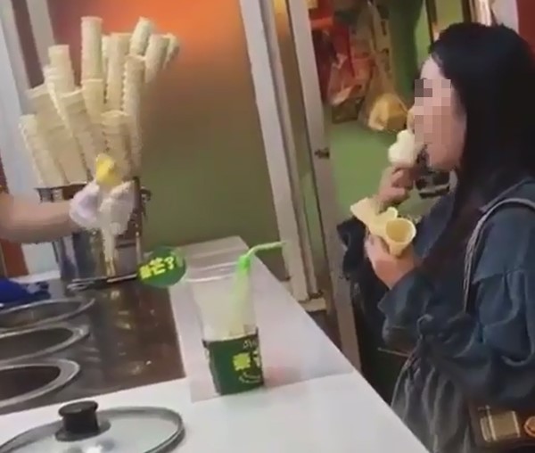영상 속 여성이 과자를 먹어버리자 직원은 당황한 듯 웃으며 아이스크림을 다시 건넸다가 또다시 아이스크림만 쏙 빼갔다.