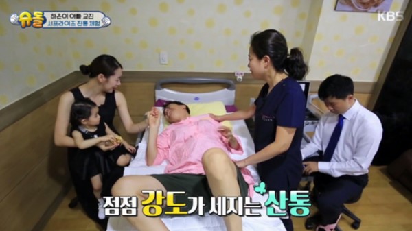 남편은 진통 체험부터 시작하게 됐다고 밝히며 “지옥을 보고왔다. 그나마 50%로 5분 정도 했는데, 5분이 5,000년 같았다”고 체험 소감을 전했다.