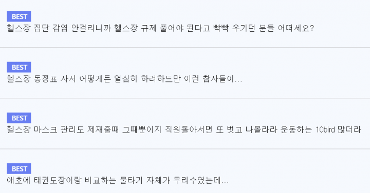 해당 소식을 접한 누리꾼들은 “헬스장 집단 감염 안걸린다는 분들 다 어디갔냐?”, “이러다 또 헬스장 이용 못하는 거 아니냐”, “제발 말 좀 들어라”등의 부정적인 반응을 보이고 있다.