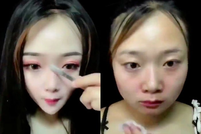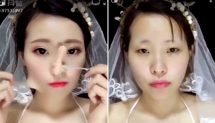 코를 뜯어내고 메이크업을 모두 지우자 여성은 처음 모습과 너무 달라 마치 다른 사람처럼 보인다.