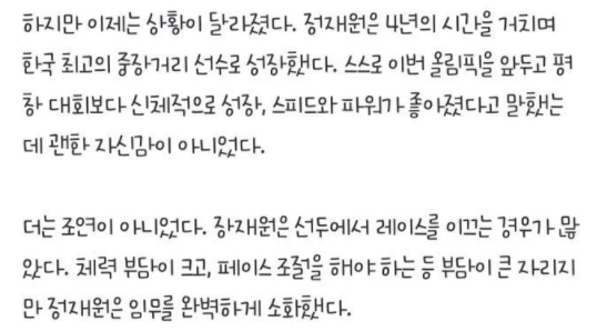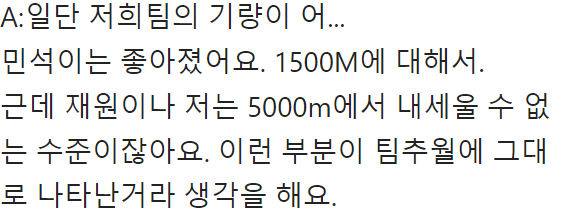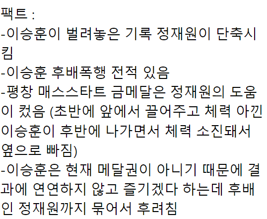 한국팀의 맏형 이승훈은 이날 레이스를 마친 뒤 방송 인터뷰에서 “최선을 다했기 때문에 결과를 받아들인다. 우리의 수준을 확인했다. 다음 올림픽을 위해 더 끌어올려야 한다”고 말했다.