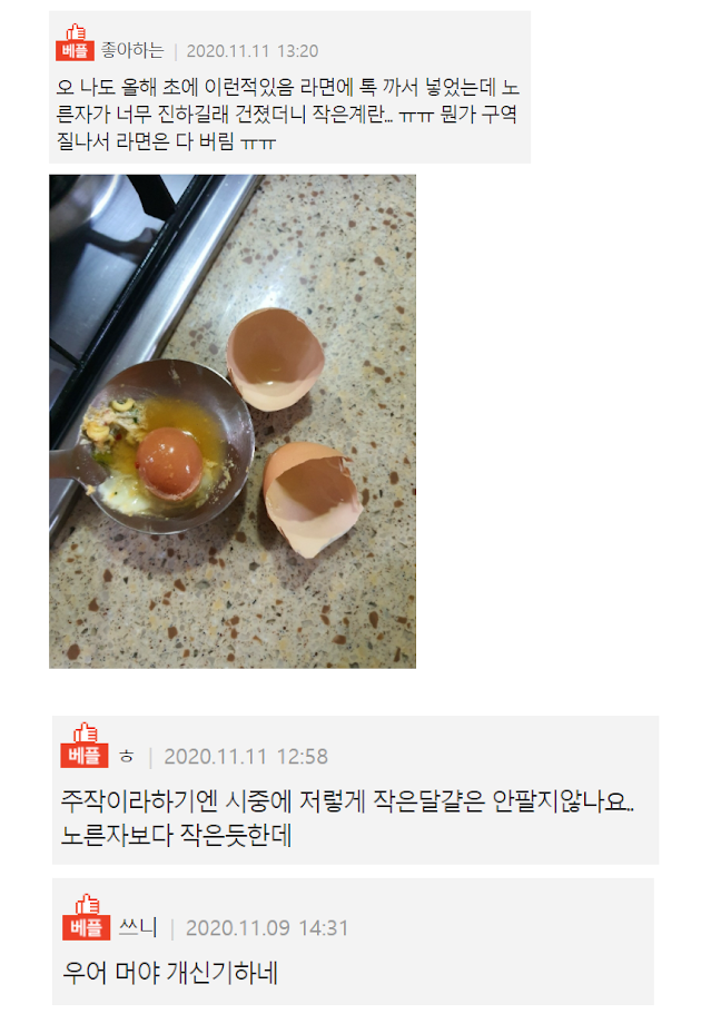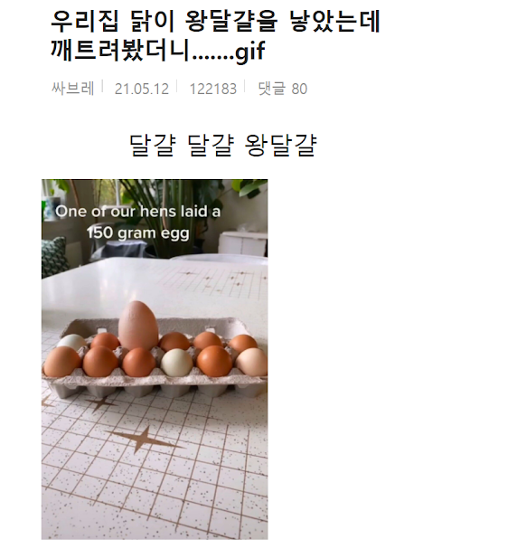 작성자 A씨는 “우리집 닭이 왕달걀을 낳았는데 깨트려봤더니……gif” 라는 제목의 글로 많은 이들의 궁금증을 증폭시켰다.