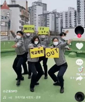 그들은 4개의 팻말을 들고 있는데, 거기에는 ‘군포 SPO’, ‘WITH’, ‘학교폭력’, ‘OUT’이라고 적었고 이는 학교폭력 방지 목적의 영상으로 보인다.