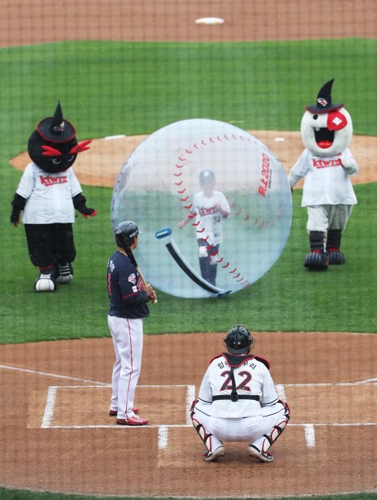 코로나19 여파로 인해 예정보다 늦게 개막했지만, 이 와중에도 ‘안전’과 ‘방역’을 강조해 이색 시구를 선보였다.