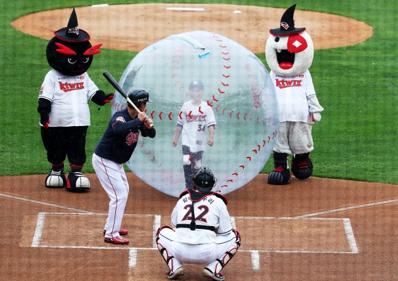 이라온 군은 야구공 모양의 대형 투명공 안에 들어가 투수 마운드에 오른 뒤 직접 홈플레이트까지 걸어가는 방법으로 에어볼을 굴려 시구를 선보였다.