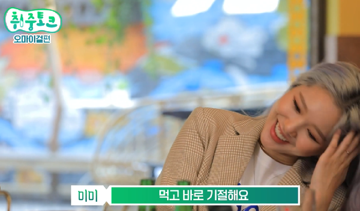 미미는 “맥주 미니 중 사이즈 한 캔의 3분의 2 정도를 마셔요”라며 “먹고 바로 기절한다”고 말했다.