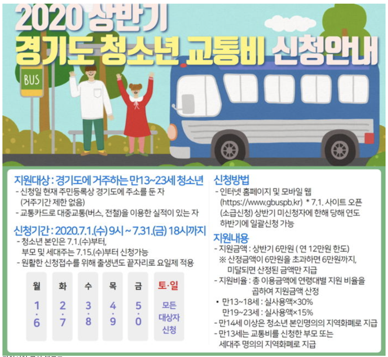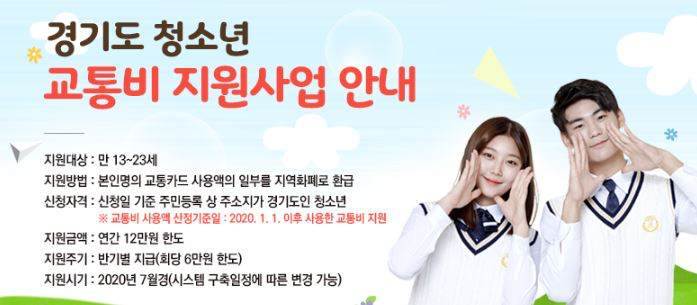 7월 1일 부터 신청이 시작된 이 복지는 만 13~23세를 대상으로 하는 ‘경기도 청소년 교통비 지원 사업’이다.