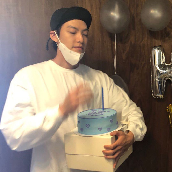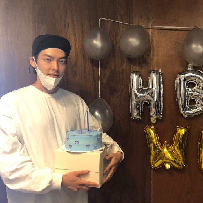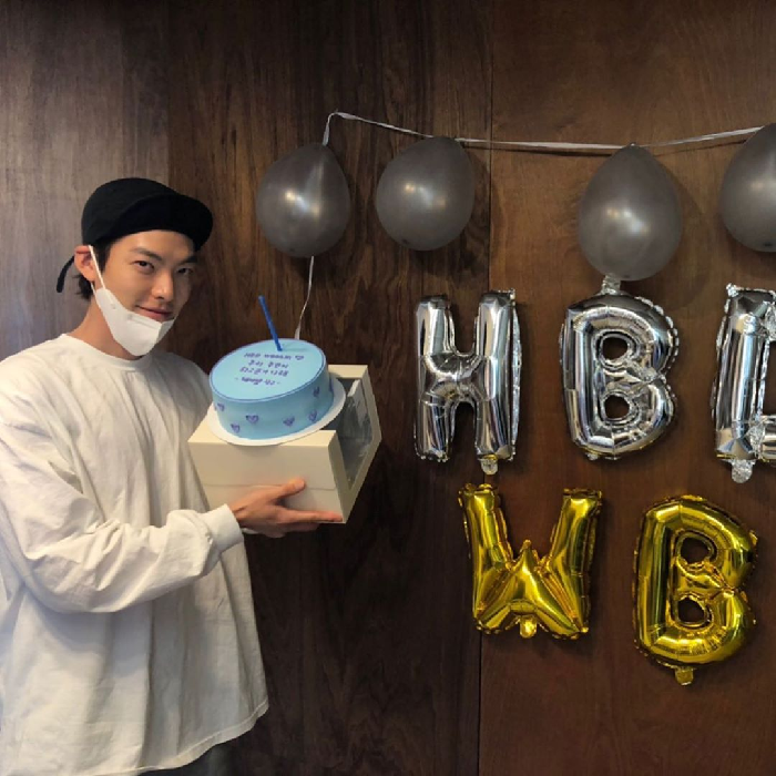 김우빈은 파티 풍선을 붙인 벽 앞에 서서 소속사가 선물한 레터링 케이크를 들고 있다.