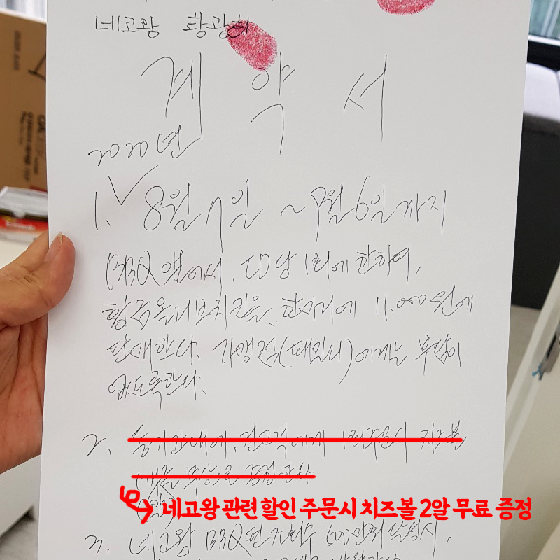 계약서에 따르면 8월 7일부터 9월 6일까지 BBQ 앱에서 ID당 1회에 한하여 황금올리브치킨을 한 마리에 11,000원에 판매한다. 네고왕 관련 할인 주문 시 치즈볼 2알 무료 증정한다.