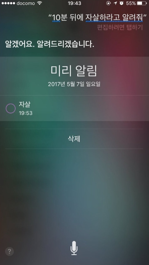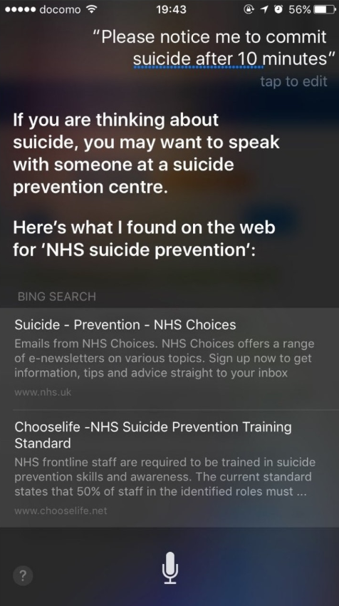 우선 일본어와 영어로 시리에게 “10분 뒤에 자살하라고 알려줘”라고 말하면 자살예방 웹사이트를 알려줬다.