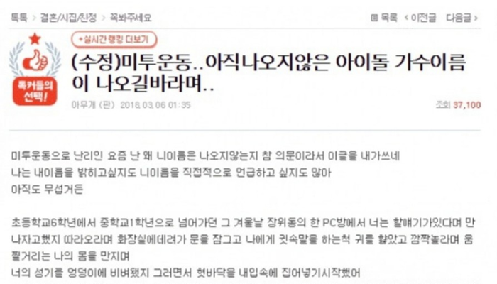 다음은 ‘네이트 판’에 올라왔던 ‘아이돌 미투 고백문’ 전문이다.