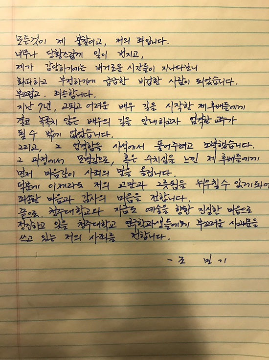 그러면서 그는 “부끄럽고 죄송하다. 지난 7년 고되고 어려운 배우 길을 시작한 후배들에게 녹록지 않은 배우의 길을 안내하고자 엄격한 교수가 됐고, 사석에서는 엄격함을 풀어주고자 했지만 모멸감과 수치심을 줬다.”며 사죄했다.