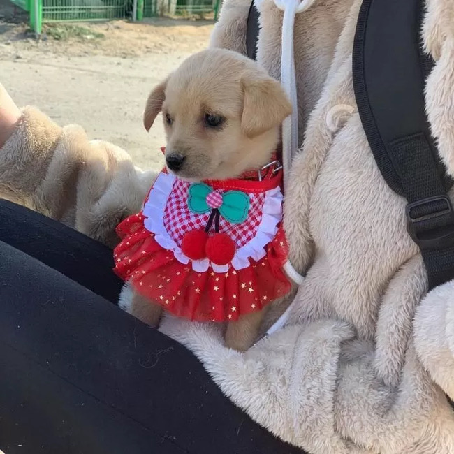 예쁘게 차려입고 새로운 주인을 만나러 기대에 찬 눈빛으로 입양되었던 귀여운 아기 강아지가 가슴 아픈 일을 당했다.
