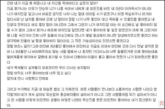 A씨는 “성별이 어떻든 나를 어떻게 속였든 여전히 그 사람을 좋아한다”고 고백하며 “그러나 이제는 그 사람과 내가 절대 이어질 수 없다는 걸 알기에 포기한다”고 마무리했다.