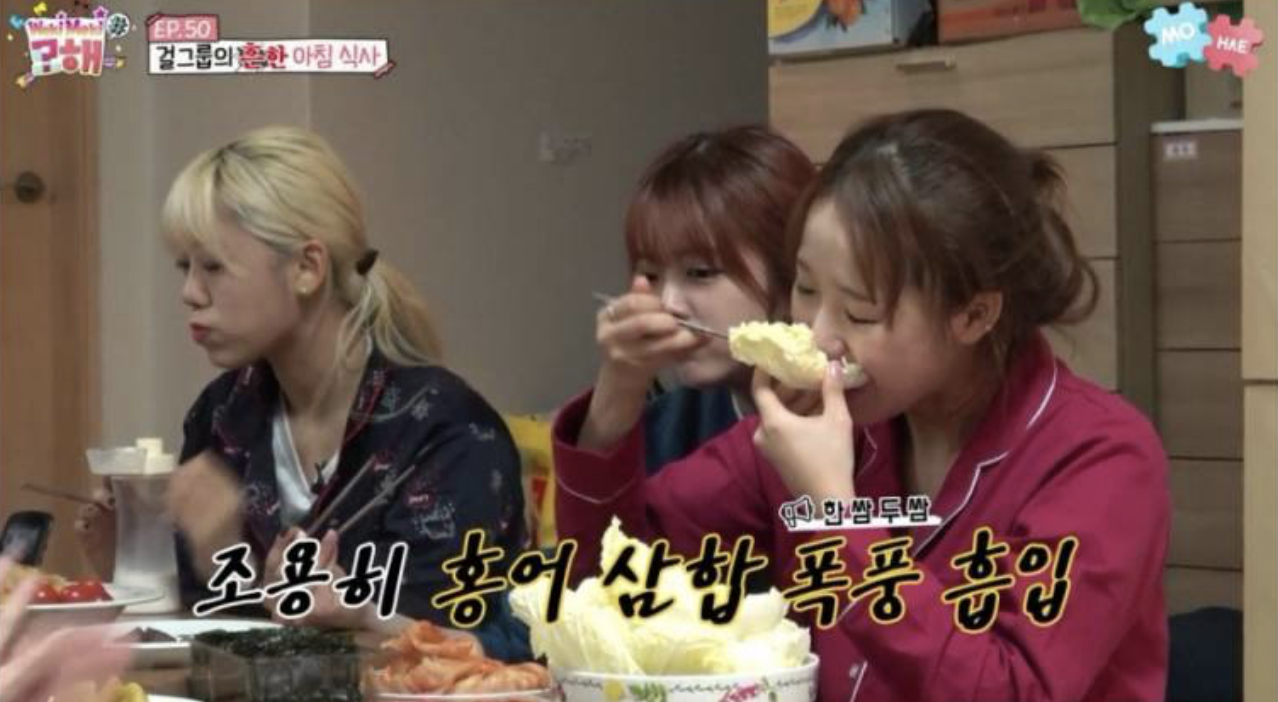 그리고서 아침 식사라는 것을 잊은 듯 폭풍 흡입을 이어갔고, 쉴 새 없이 홍어삼합을 즐기는 유정의 모습에 멤버들은 신기한 듯이 쳐다봤다.