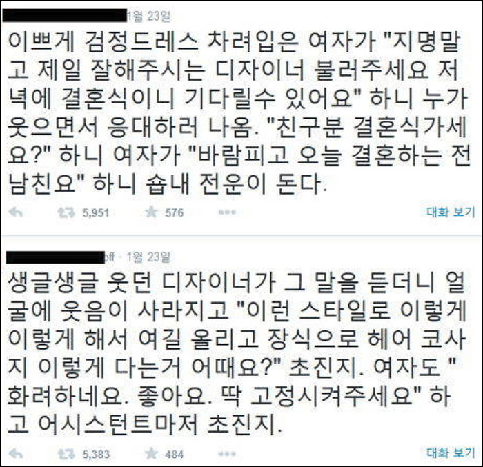 덧붙여 디자이너들은 여성 손님이 입고 온 드레스의 주름까지 걱정하며 “스팀으로 펴주겠다”는 친절까지 보였다고 이 누리꾼은 말했다.