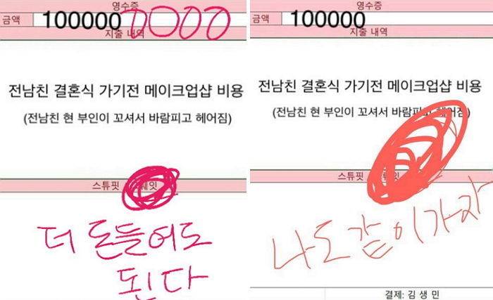 지난 2월 이 채팅방에는 ‘전 남친 결혼식 가기 전 샵 비용’이라는 용도로 금액 10만원짜리 영수증 사진이 올라오게 됐다.