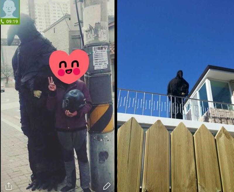 제보자에 의하면 거대 까마귀로 보이는 정체불명의 형체는 키가 2미터가 넘어보이며 담벼락을 여기저기 둘러보며 다니고 있다.