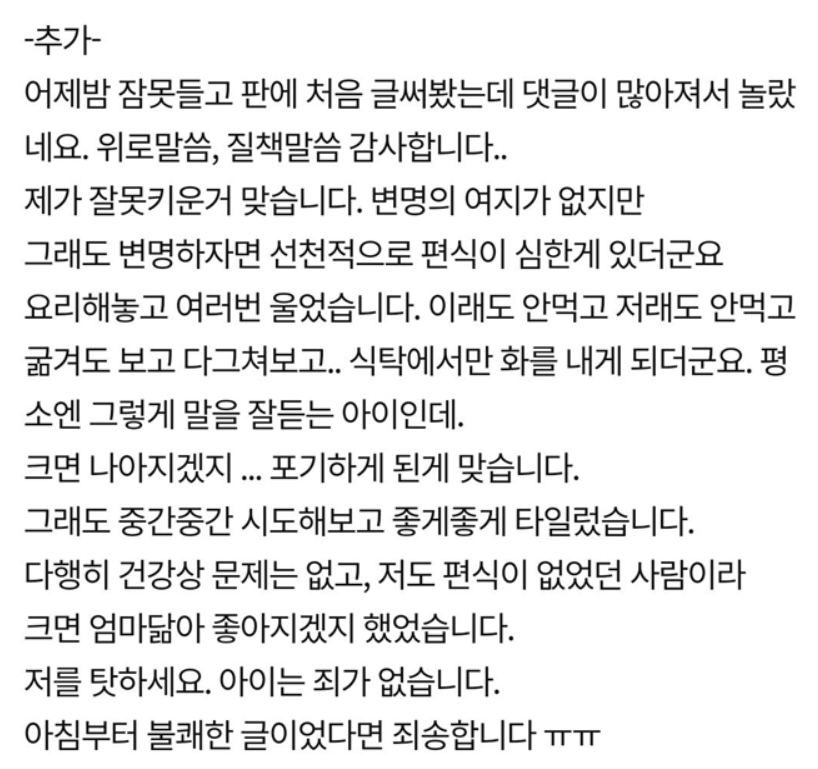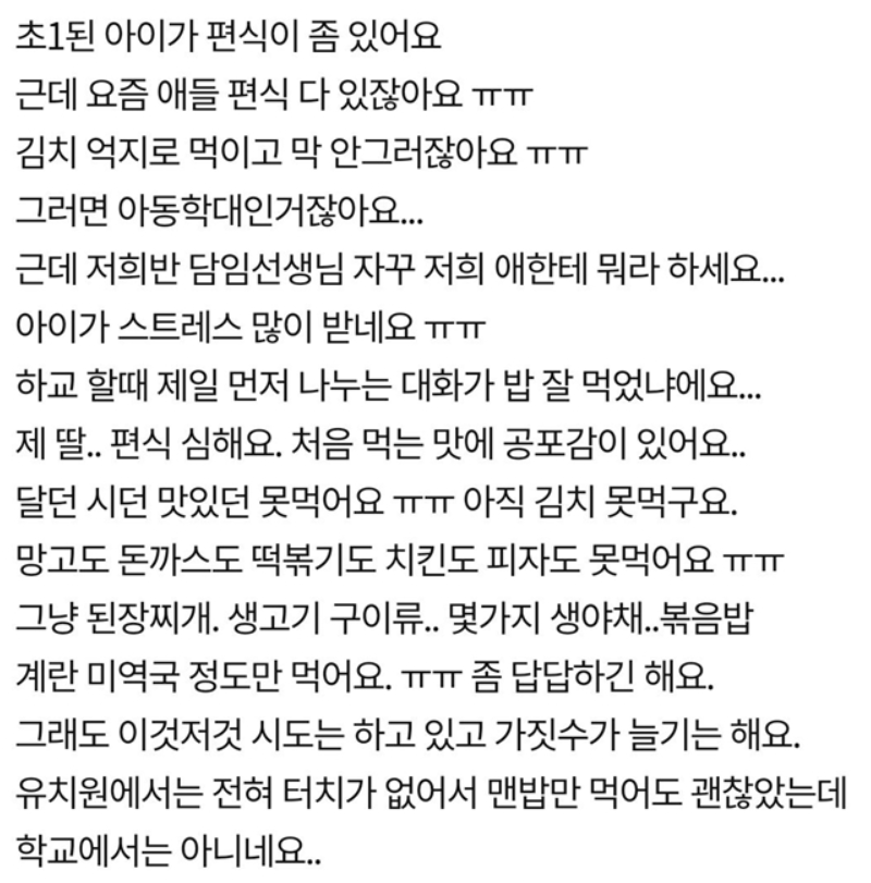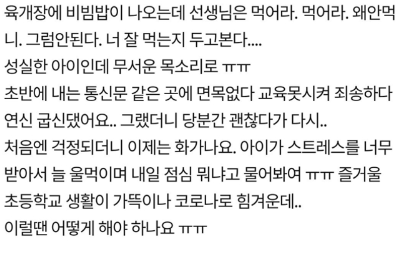 이어서 “담당 선생님이 편식하는 아이에게 억지로 음식을 권유했고, 저는 처음에 걱정됐지만 이제는 화가 납니다.”라고 말을 덧붙였다.