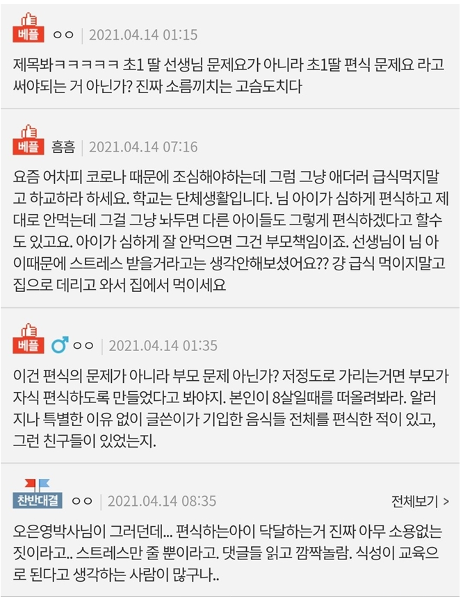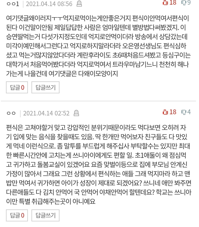 이를 본 온라인 커뮤니티 네티즌들은 “학교는 단체생활이고, 아이 한 명 편의를 봐준다면 다른 아이에게도 영향이 갈 수 있습니다.”, “편식하는 건 진짜 어쩔 수 없는 거 같습니다.”라는 반응을 보였다.