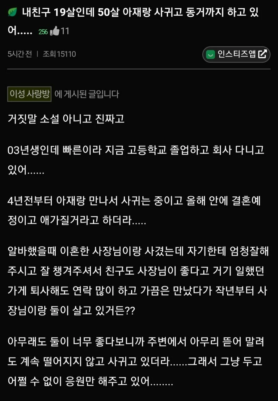 최근 한 온라인 커뮤니티에는 ‘내 친구 19인데 50 아재랑 사귀고 동거하고 있어’라는 놀랍고 충격적인 사연이 올라왔다.