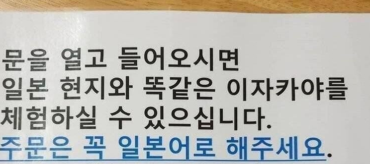 “일본 현지와 똑같은 이자카야를 체험하기 위해 주문은 꼭 일본어로 해주세요”라는 내용에 네티즌들은 경악을 금치 못하고 있다.