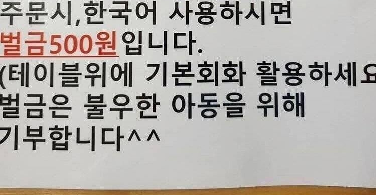 또 “주문 시 한국어를 사용하시면 벌금 500원입니다. 주의해주세요.”라는 내용도 적혀있었다.