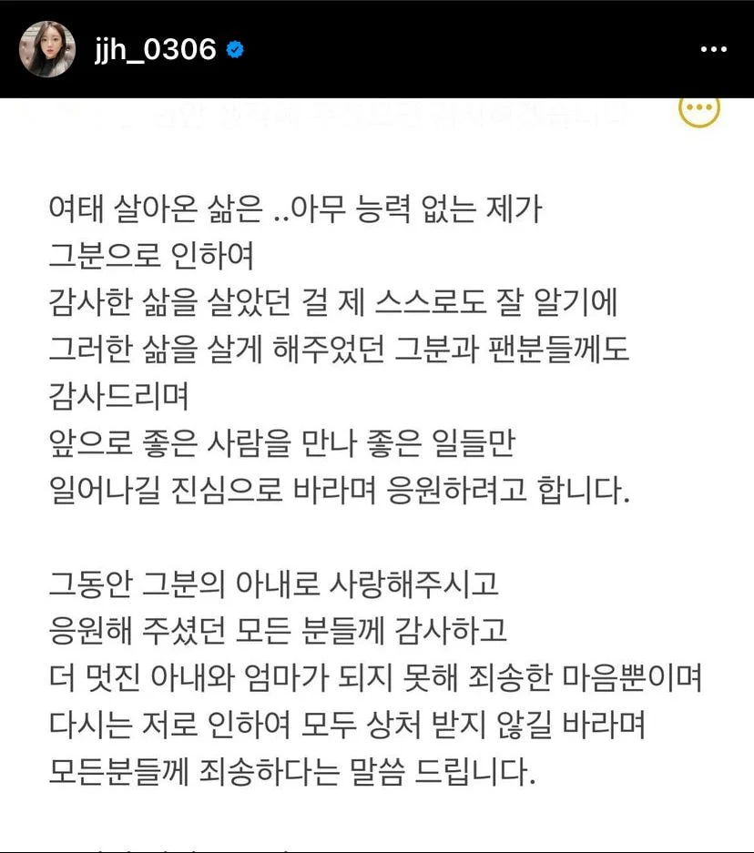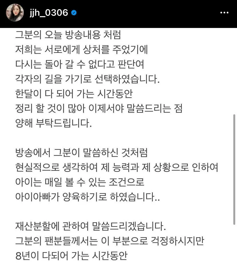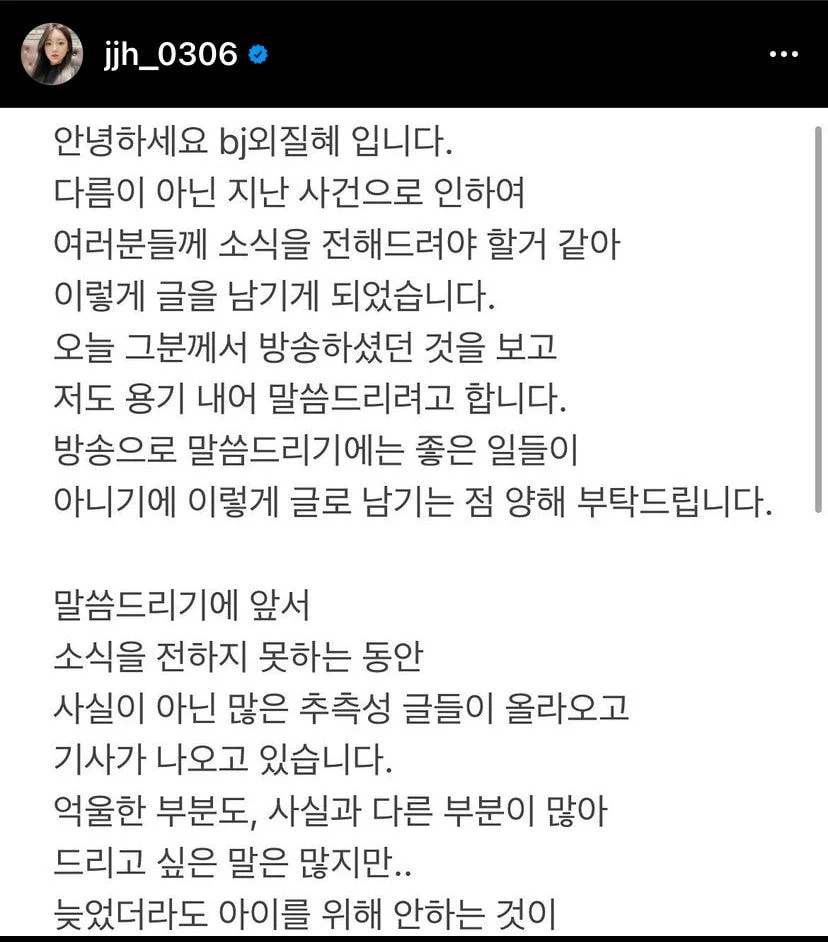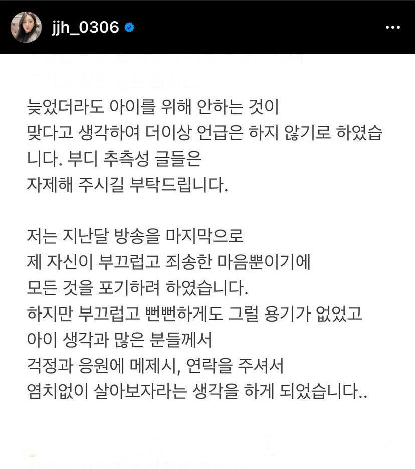 그러면서 “소식을 전하지 못하는 동안 사실이 아닌 추측성 글들이 올라오고, 기사도 났다”며 “억울한 부분도, 사실과 다른 부분도 많아 드리고 싶은 말이 많지만, 아이를 위해 안 하는 것이 맞다 생각해서 더이상 언급하지 않기로 했다”며 추측성 루머 자제를 당부하기도 했다.