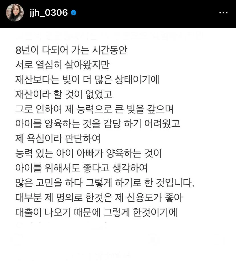 아이의 양육권을 철구가 갖는 것에 대해 “현실적으로 생각해 제 능력과 상황으로 인해 아이를 매일 볼 수 있는 조건으로 아빠가 양육하기로 했다”며 “8년의 결혼 생활 동안 서로 열심히 살았지만 재산보다 빚이 더 많은 상태였고, 제 능력으로 큰 빚을 갚으며 아이를 양육하는 건 감당하기 어렵고, 제 욕심이라 판단 돼 능력 있는 아이 아빠가 양육하는 것이 아이를 위해서도 좋다고 생각해 고민해 결정했다”고 현재 상황을 설명했다.