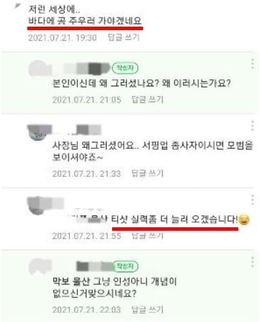 실제로 해당 남성은 서핑 커뮤니티에서 ‘사과할 마음은 없냐’는 질문에 “누구한테요? 바다의 물고기한테요?” 라고 답변을 달며 댓글 질문한 사람에게 비아냥댔다.