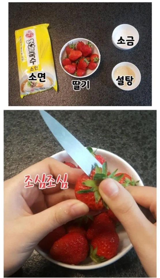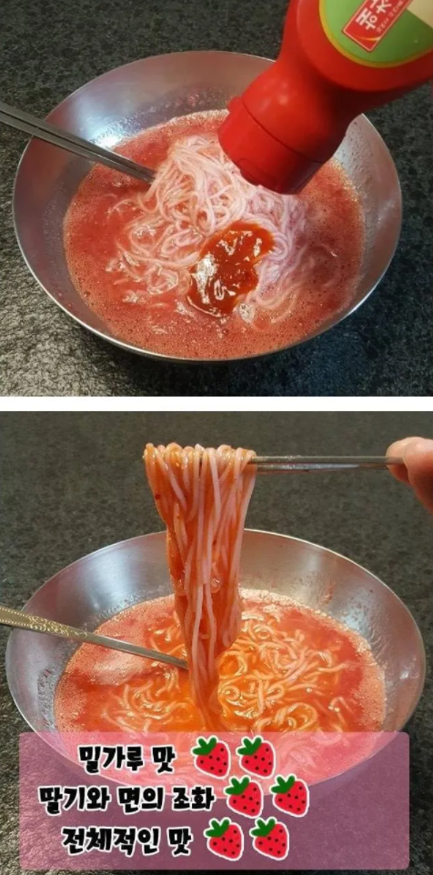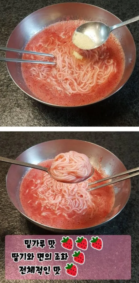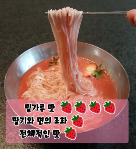 게시글에는 딸기 국수를 만들기 위한 레시피가 올라와 있었는데 그 내용이 충격을 주고 있다.