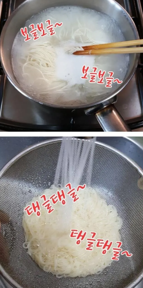 그 후 준비한 소면을 물에 삶은 후 찬물로 헹구어 준 다음 먼저 만들어 놓은 딸기 국물에 말면 요리가 완성된다.