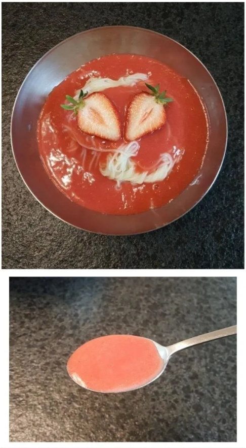 해당 요리의 레시피를 올린 네티즌은 “밀가루 맛은 3점 딸기와 면의 조화 2점 전체적인 맛 1점입니다.”라고 답했다.