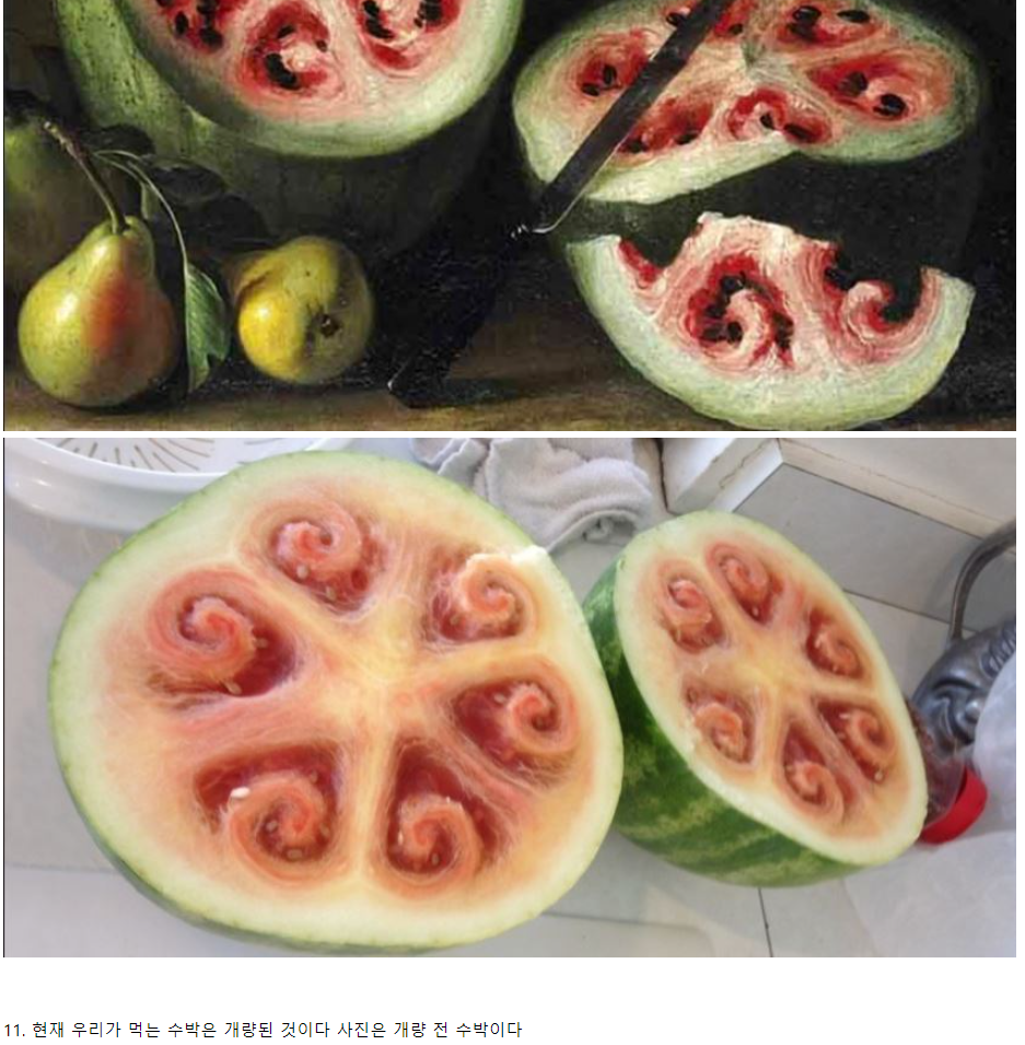 그리고 우리가 먹는 수박은 개량된 품종으로 개량 전 수박의 모습은 흔히 알고 있는 수박의 모습과는 다른 모습이다.