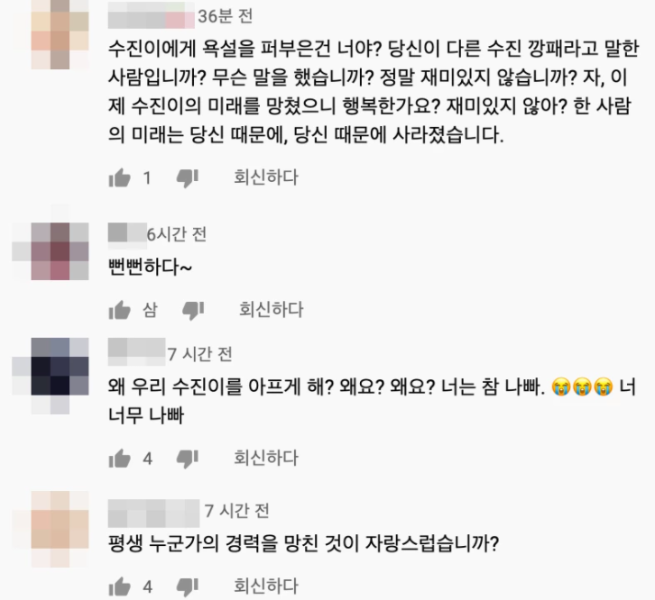 그러나 수진의 일부 외국 팬들은 해당 영상에 “수진이에게 욕설을 퍼부은건 너야”, “왜 우리 수진이를 아프게 해?”, “평생 누군가의 경력을 망친 것이 자랑스럽냐”, “잘 살고 있는데 너 때문에 수진이를 못 보잖아” 등 다양한 비난의 댓글이 많다.