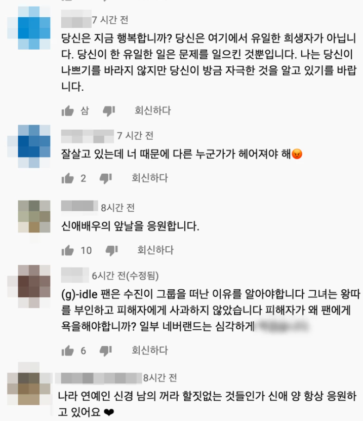 소식이 알려지자 수진의 외국 팬들은 당시 학폭 피해자로 알려졌던 서신애의 유튜브 채널에 찾아가 그를 비난하는 댓글을 남기고 있다.