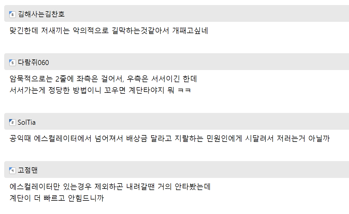 이어서 “어떤 분이 에스컬레이터에 서서 내려가지 않고 가만히 있었습니다. 결국 뒤에 40명 이상의 사람들이 못 지나갔습니다.”라고 말을 덧붙였다.