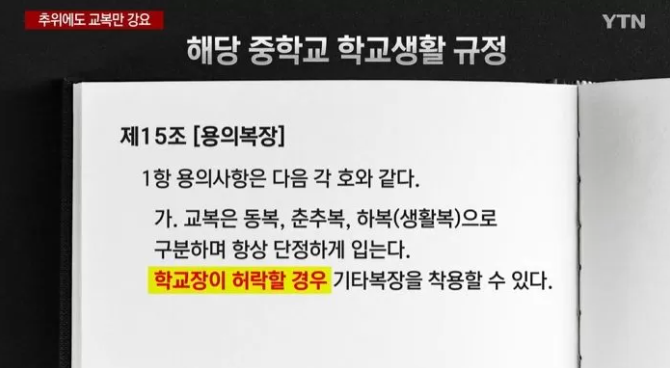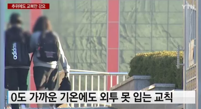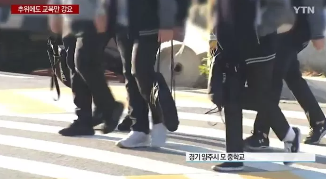 지난 22일 YTN은 경기 양주시에 있는 한 중학교 학생들이 추운 날씨에도 외투 착용을 하지 못하고 있다고 보도했다.