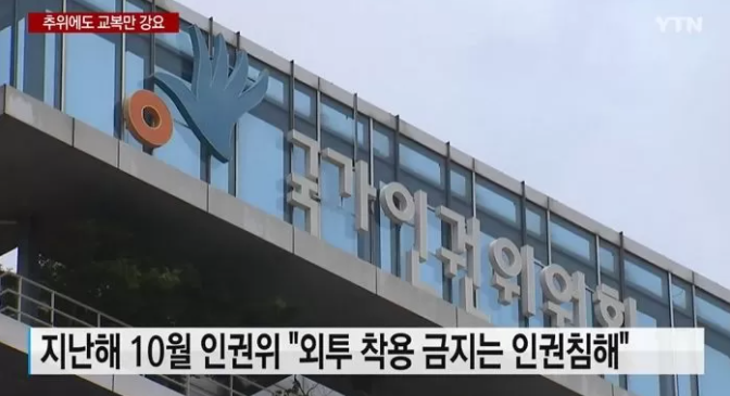 지난해 국가인권위원회는 “교내에서 학생들의 외투 착용을 금지하는 것은 인권침해”라고 지적했지만 여전히 일부 학교에서는 옛 규정을 요구하고 있는 것이다.