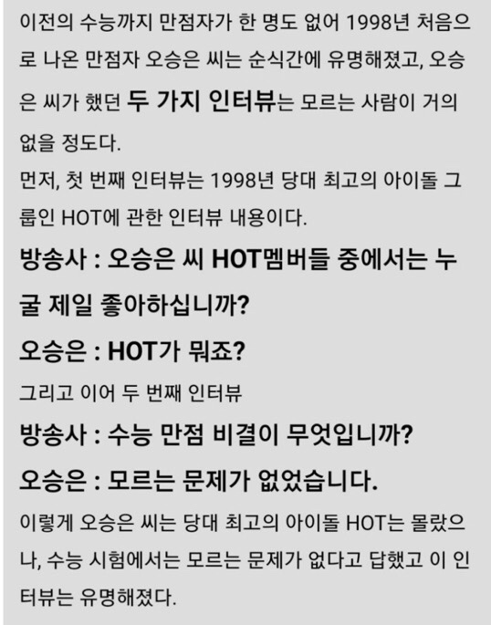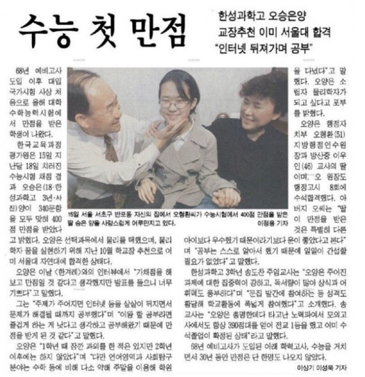 이전의 수능까지 만점자가 한 명도 없어 1998년 처름으로 나온 만점자 오승은 씨는 순식간에 유명해졌고, 오승은 씨가 당시 했던 인터뷰 내용은 모르는 사람이 거의 없을 정도다.