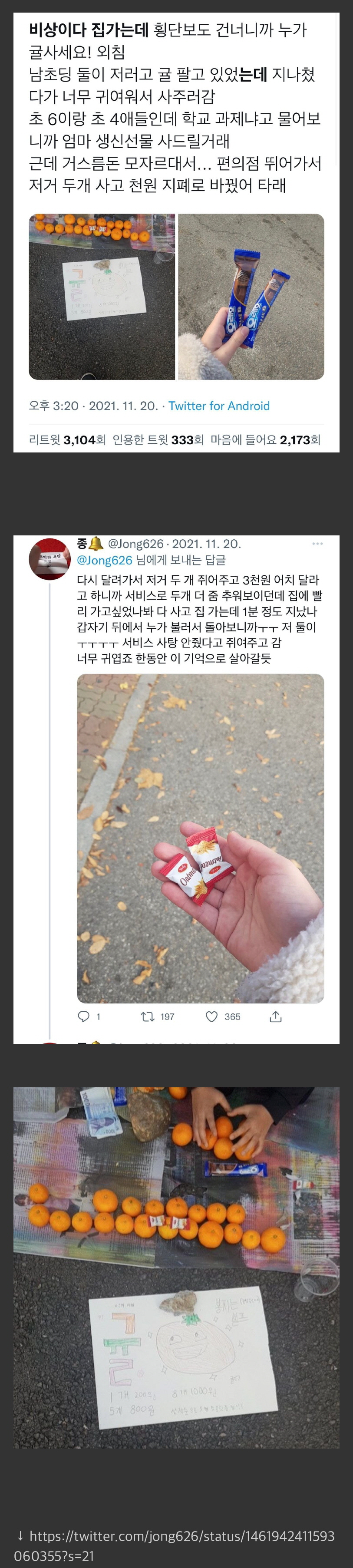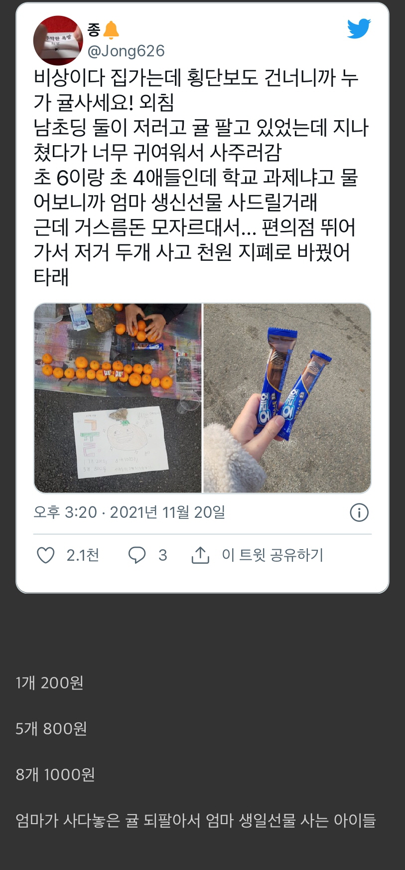 이어서 글쓴이는 “아이들에게 왜 귤을 팔고 있냐고 물어보니 엄마 생신 선물을 사드리기 위해서 돈을 벌고 있다고 답했습니다.”라고 말을 덧붙였다.