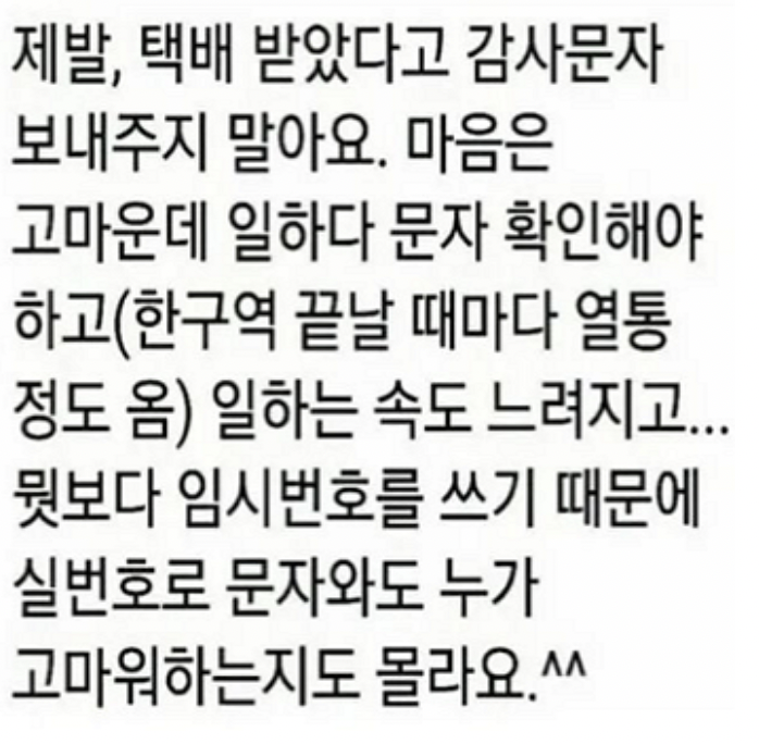 하지만 이를 기분 나쁘게 받아들이면 안되는 이유는 일부 택배 기사들은 한 구역에서 모든 택배를 배송할 때마다 열 통 이상의 문자를 받는다고 한다.