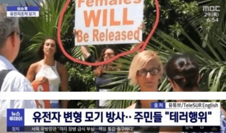 MBC 뉴스는 노후 은퇴 거주지로 각광받는 플로리다주에서 유전자 변형 모기 방사를 막기 위한 주민들이 시위를 하고 있다고 보도했는데 현지 주민들은 유전자 변형 모기 방사에 대해 테러행위라며 반대했다.