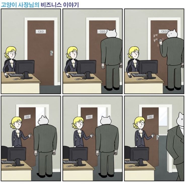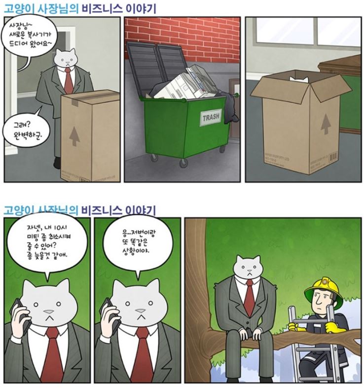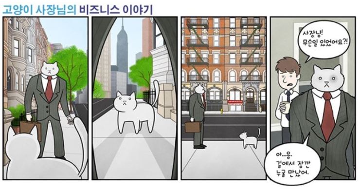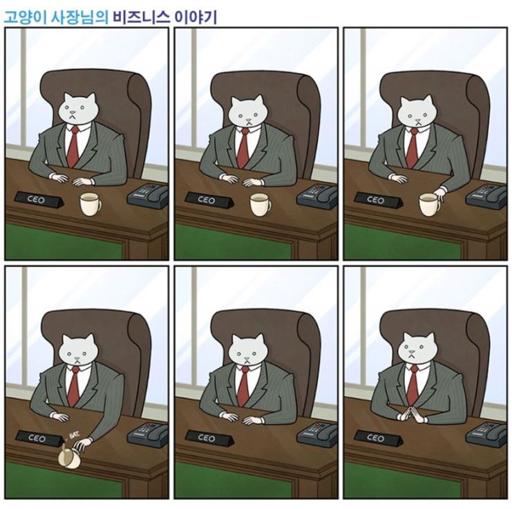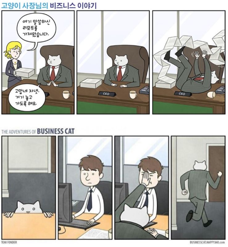 해당 만화는 영국 웹툰인 ‘The Adventures of Business Cat (고양이 사장님의 비즈니스이야기)’의 한 장면으로 Tom Fonder 가 그렸다.