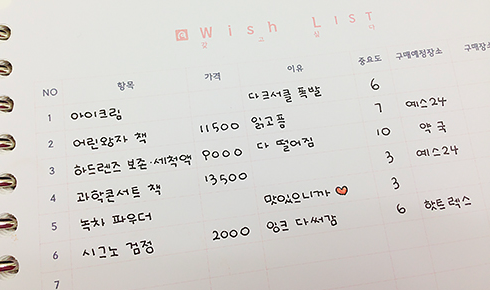 칫솔이나 치약 같은 소모품이나 500원 짜리 아이스크림 등은 위시리스트에 적히지 않는다.
