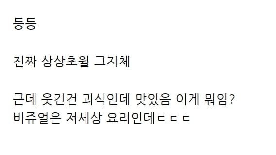 그러면서 “진짜 상상초월 그 자체”라며 “근데 웃긴 건 괴식인데 맛있음 이게 뭐임? 비주얼은 저 세상 요리인데 ㄷㄷ”이라고 전했다.